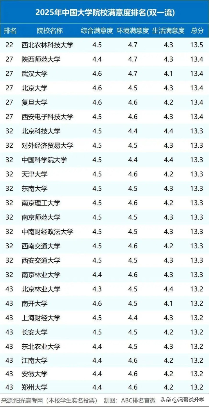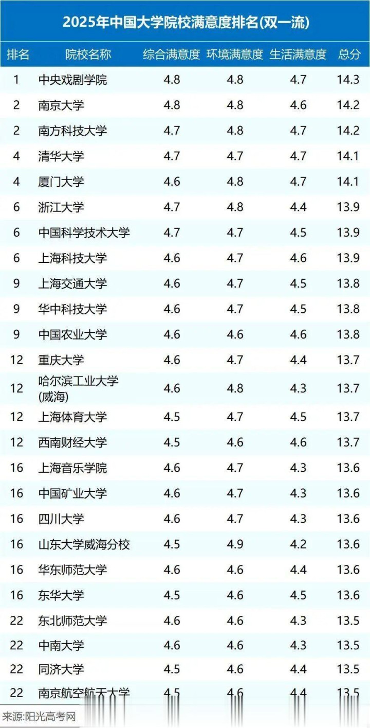 谁能想到,2025双一流学生满意度榜单刚出炉,最炸的不是中科大力压群雄,而是南京大学和南方科技大学以 4.71 分并列第二,把浙大挤到了第六名!要知道浙大可是分数、资源、名气样样能打的顶尖名校,今年却比去年下滑两位,4.38 分的成绩和自身光环严重脱节。反观南科大,去年还只有 4.56 分,今年直接逆袭追平南大,新兴高校能和老牌 985 掰手腕,这波操作彻底打破了 “名校 = 满意度” 的固有认知。