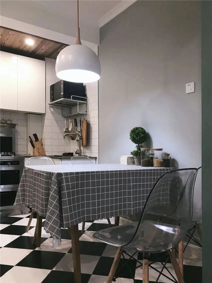 颜值与氛围:餐厨地面铺黑白色地砖,自带现代时尚感;餐椅选透明款式,减少视觉遮挡,让小空间更显通透,与整体轻奢风格呼应。