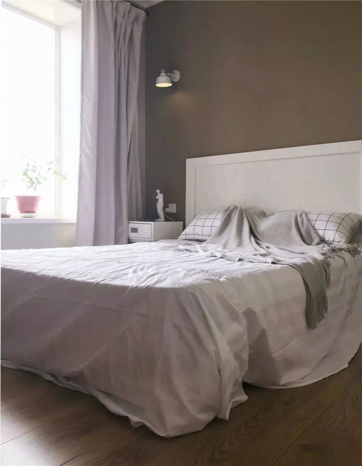 主卧墙面刷浅咖灰色,搭配白色床架与床品,整体色调柔和,营造出简单舒适的睡眠氛围;窗台摆上几盆绿植,为空间注入自然生机,避免纯色墙面的呆板。