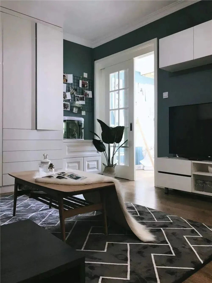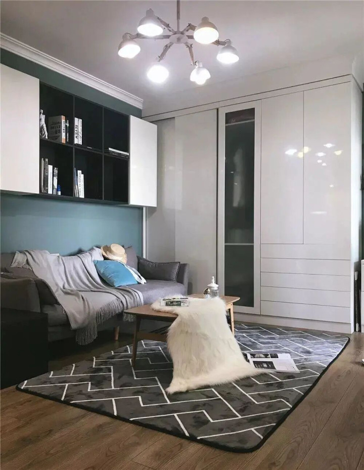 柜体以白色为主,搭配复古色调的背景墙,中和了白色的单调,更显格调;再配上舒适的地毯、毛毯等软装,悄悄注入轻奢感,让空间既实用又有质感。