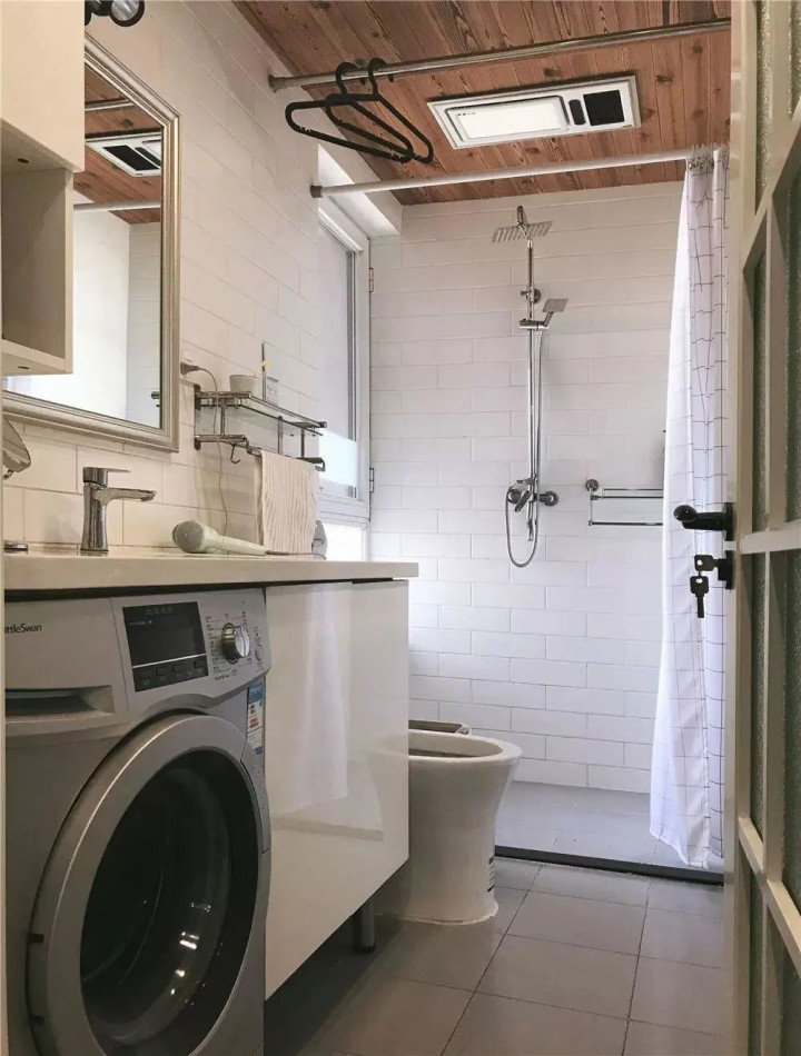 卫生间空间宽敞,采用一字形布局:洗手台、马桶、淋浴区依次排列,动线流畅;洗衣机嵌入洗手台下方,节省空间;用浴帘搭配挡水条做干湿分离,避免洗澡后地面积水,保持卫生间整洁干爽。