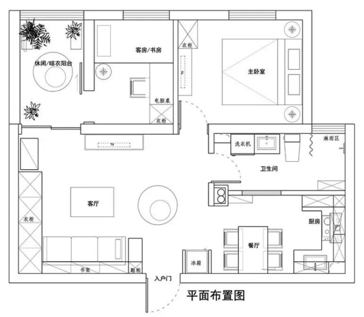 从平面布置图能看出,设计师对小空间的利用十分精准:通过 “餐厨一体” 节省面积,将客厅打造成收纳核心区,同时兼顾各空间的舒适度,让有限面积承载多样需求,不显拥挤。
