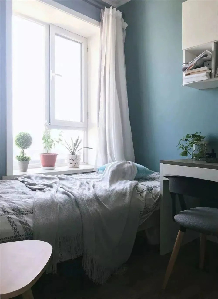 次卧把床靠着窗户摆放,留出更多地面空间做书桌和衣柜,满足办公与收纳需求;同样在窗台上放绿植,一抹绿色让空间更显惬意,日常看书、休息都很舒服。